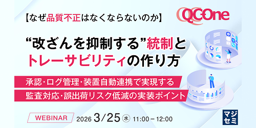 一覧はこちら| 2026年3月2日 | セミナー | 【なぜ品質不正はなくならないのか】“改ざんを抑制する”統制とトレーサビリティの作り方~承認・ログ管理・装置自動連携で実現する、監査対応・誤出荷リスク低減の実装ポイント~(2026.03.25)New! |