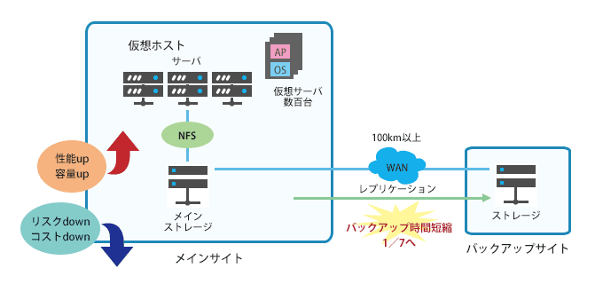 既存の仮想基盤ストレージ環境の遠隔バックアップは、重複排除ストレージにバックアップしたものを転送する複雑な構成になっていた。機器構成を見直してシンプルにし、遠隔バックアップ時間の短縮を実現した。