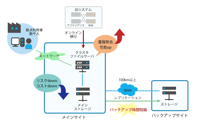 本プロジェクトでは、ファイルサーバ統合、ファイルサーバ移行、災害対策の実装など、豊富な導入実績・ノウハウ、技術力を生かし、お客様の課題解決のためのシステム環境と運用改善をコーディネートしました。