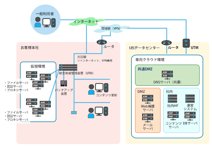 運用を可能な限りアウトソーシングしたいという要望が強かったので、近くにあった方が良いファイルサーバや認証サーバ、PROXYサーバはハイパーバイザを用いたプライベートクラウドをオンプレで、Webシステムやメール、施設運用管理システムは当社データセンターでPaaS構築した。