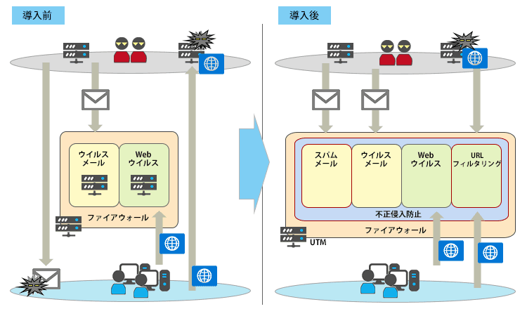 セキュリティ対策機能を1種類の装置(UTM)に統合、加えて新規対策機能を追加し、セキュリティ強化およびセキュリティ環境の最適化を実現した。
