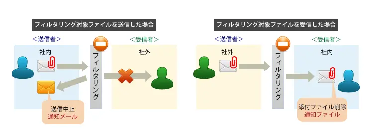 ウイルスの感染媒体となりうる「実行可能型ファイル*1」が添付されているメールについて、受信時にファイルを削除し感染のリスクを軽減します。