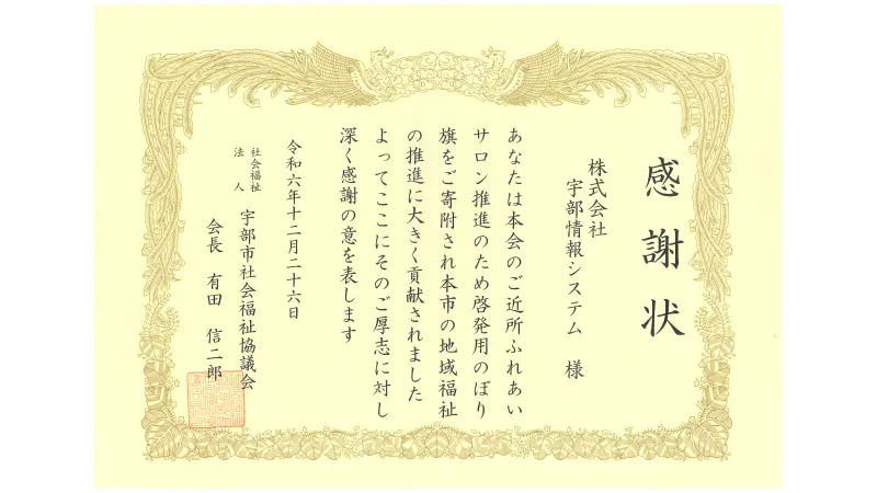 当社宇部情報システムは、宇部市社会福祉協議会により毎年開催されている「ご近所ふれあいサロン」へ、のぼり旗を100枚寄贈いたしました。
