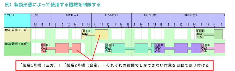 「FLEXSCHE」は、製品のサイズや仕様にあった設備を、自動で選択することができます。また、設備の負荷を考慮し、代替設備に自動で割り付けます。